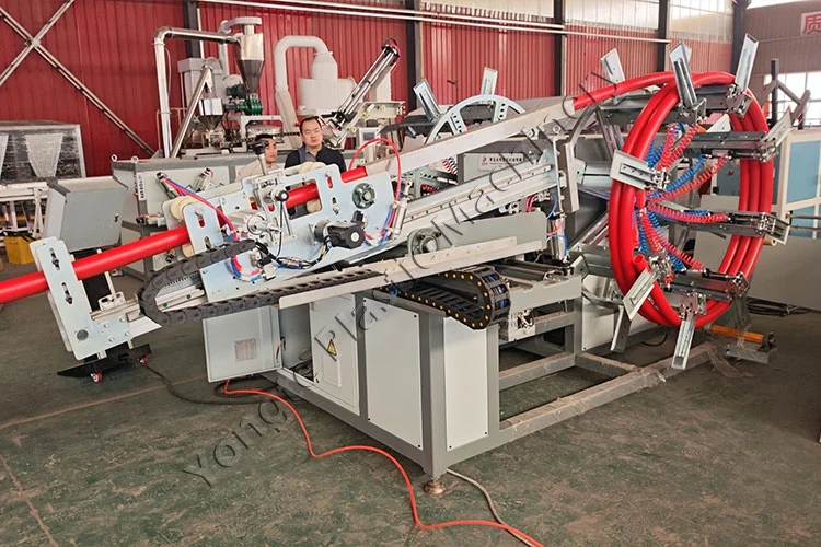 Nel 2025, abbiamo consegnato con successo due set personalizzati di avvolgitrici automatiche per tubi in PE a un'azienda argentina leader nella lavorazione della plastica. Il cliente richiedeva soluzioni di avvolgimento ad alta efficienza da abbinare alle linee di estrusione di tubi in PE ad alta velocità recentemente ampliate. L'ordine comprendeva due unità specializzate: una macchina avvolgitrice automatica a doppia stazione ottimizzata per tubi con diametro da 15 a 32 mm e un altro modello ad alta capacità progettato per diametri da 20 a 63 mm. Queste macchine si integrano perfettamente con le linee di estrusione di tubi in PE ad alta velocità per avvolgere automaticamente i tubi in rotoli uniformi. Dotata di un sistema di conteggio automatico della lunghezza, la macchina avvia il taglio automatico e il trasferimento della stazione una volta raggiunta la lunghezza target. Contemporaneamente fissa il rotolo finito e attiva un allarme per l'imballaggio, fornendo una soluzione di avvolgimento completamente automatizzata. Rigorosi test di fabbrica prima della spedizione hanno garantito un funzionamento stabile in loco dopo la consegna.